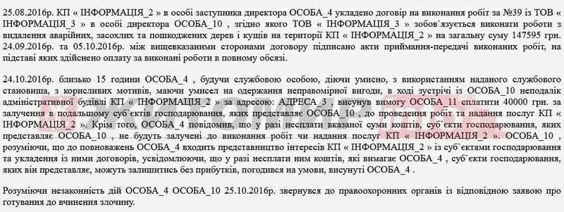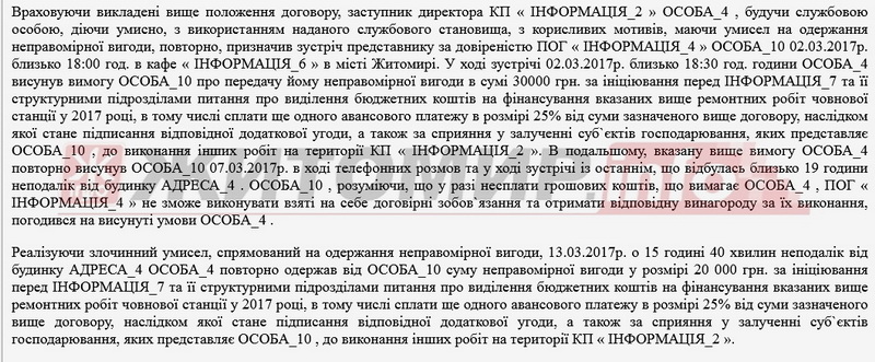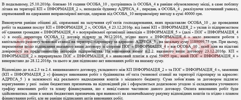 Зазначається, що Вадим Поповіченко в липні 2016 року був призначений на посаду заступника директора КП «Парк» й отримав право укладати договори на виконання підрядниками робіт по договорах з комунальним підприємством. Вже за кілька місяців Поповіченко почав вимагати від підрядників платити за те, що їх будуть залучати до виконання робіт у житомирських парках. У вироці описується два таких епізоди: роботи з видалення аварійних, засохлих та пошкоджених дерев і кущів на території КП «Парк» на суму 147 тис. 595 грн і капітальний ремонт човнової станції на території гідропарку за 1 млн 189 тис. 099,75 грн. Заступник директора КП просив у першому випадку «відкат» у розмірі 40 тис. грн, а у другому – 30 тис. грн.