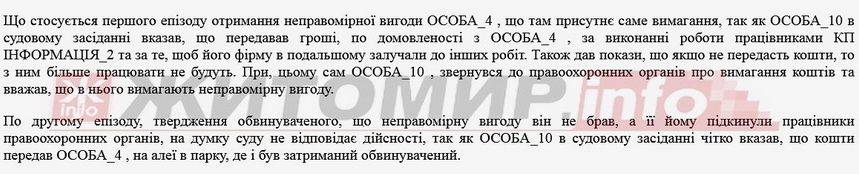 «ОСОБА_4 надав показання, що в нього була розмова з ОСОБА_10 і коли він відійшов, то його відразу скрутили і показали йому кошти, однак він тих коштів не чіпав і навіть не бачив, він ні в кого не вимагав ніяких хабарів і нічого не підписував, він не мав жодного впливу на тендерні угоди, у нього не було ніякої зацікавленості і змоги. Згідно із статутом підприємства йому давалось право першого підпису, однак це право він не міг використати, тому що, в них були внутрішні розпорядження, що без директора нічого не підписується», - йдеться у вироці суду.