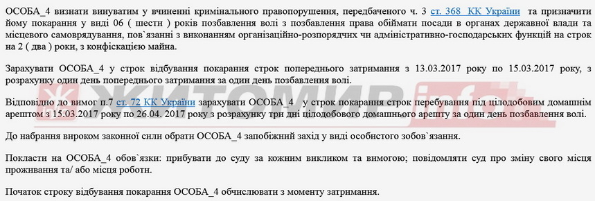 Пом’якшуючи чи обтяжувальні покарання обставини були відсутні, Вадима Пововіченка визнали винуватим у вчиненні кримінального правопорушення, передбаченого ч. 3 ст. 368 КК України та призначили йому покарання у виді 6 років позбавлення волі з конфіскацією майна. У строк відбування покарання зарахують строк попереднього затримання з 13.03.2017 року по 15.03.2017 року (1 день затримання за 1 день позбавлення волі) й строк перебування під цілодобовим домашнім арештом з 15.03.2017 року по 26.04. 2017 року (3 дні цілодобового домашнього арешту за 1 день позбавлення волі). Вироку суду ще не набрав законної сили і може бути оскаржений в апеляційному суді, до набрання вироком законної сили Вадимо Поповіченку обрали запобіжний захід у виді особистого зобов`язання.