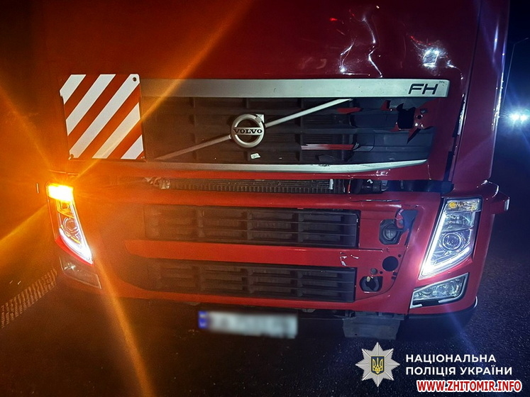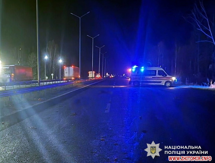 «За попередньою інформацією, 41-річний житель Київщини, перебуваючи за кермом вантажного автомобіля Volvo, під час руху в напрямку міста Звягеля здійснив наїзд на чоловіка, який знаходився на автошляху. На жаль, пішохід, 48-річний житомирянин, від отриманих травм загинув на місці ДТП», - йдеться в повідомленні.