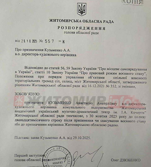 «Призначити Кузьменко Анастасію Анатоліївну в.о.директора – художнього керівника комунального підприємства «Житомирський академічний український музично-драматичний театр ім. І.А.Кочерги» Житомирської обласної ради тимчасово, з 30 жовтня 2025 року до спливу дванадцятимісячного строку після припинення чи скасування воєнного стану або до призначення керівника Житомирською обласною радою», - йдеться у документі.