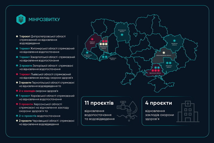 «Йдеться про 11 проєктів з відновлення водопостачання та водовідведення, а також про 4 проєкти відновлення закладів охорони здоров'я у Житомирській, Закарпатській, Запорізькій, Харківській, Дніпропетровській, Чернівецькій, Львівській, Тернопільській та Херсонській областях. Цього року державний бюджет України спрямовує 1 млрд грн субвенції на фінансування проєктів розвитку. Завдяки останнім змінам, кількість проєктів, що отримають державну підтримку, зросла зі 106 до 121», - зазначається у повідомленні.