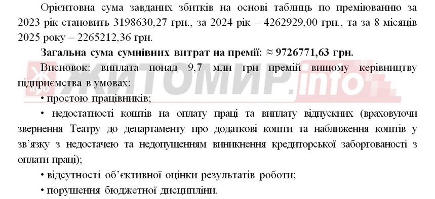 «Непродуктивні та необґрунтовані витрати на оплату праці визначених працівників Підприємства допущені з вини в.о. директора-художнього керівника Наталії Ростової, заступника директора Олександра Шкарупи, якими були підписані накази на преміювання, головного бухгалтера Валентини Кобилинської, заступника головного бухгалтера Тетяни Яхимович, якими готувалися подання на преміювання до даних наказів, чим створено ризики соціальної напруженості в колективі та втрачено можливість отримати більші доходи за відповідні періоди.