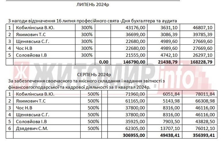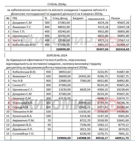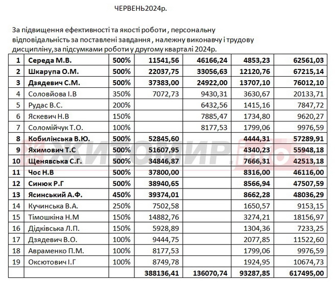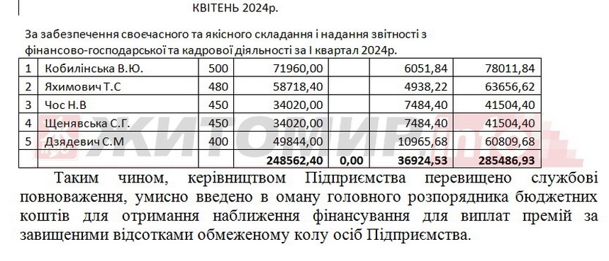 «Під час проведення аудиторського дослідження встановлено, що відповідно до наказів з особового складу про преміювання премія в переважній більшості нараховувалася та виплачувалась за найвищими відсотками 300-500% за підсумками роботи за місяць, квартал, рік або до святкових дат 5-7 особам адміністративно-управлінського персоналу та бухгалтерії», - зазначено у звіті.