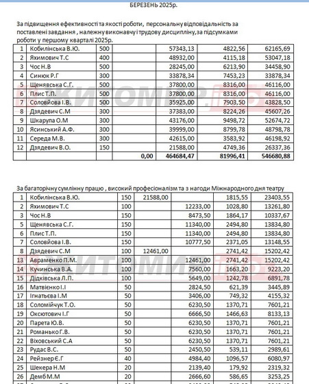 Аналогічна ситуація з виплатами премій спостерігається і у 2025 році. А от премія іншим працівникам театру нараховувалася за залишковим принципом та за найнижчими відсотками, приклад – премії за багаторічну сумлінну працю, високий професіоналізм та з нагоди Міжнародного дня театру (відзначається 27 березня). До речі, премію до Дня театру отримали й працівники бухгалтерії.