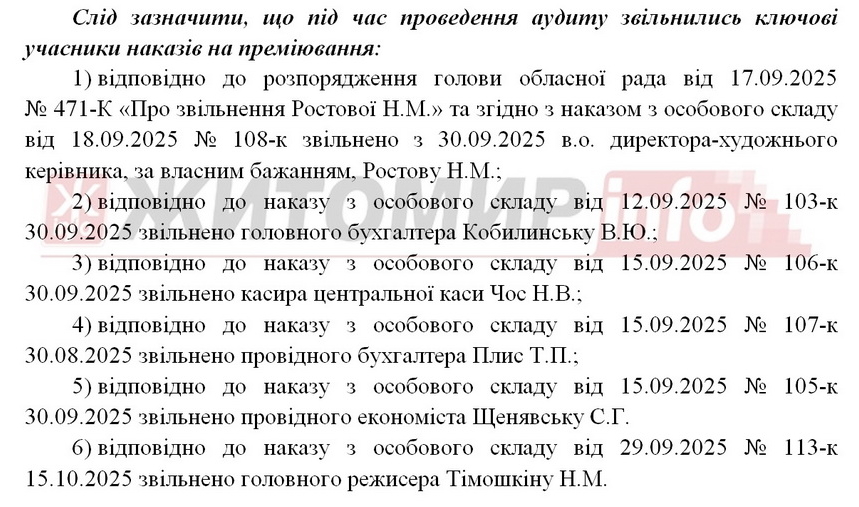 Після звільнення наприкінці вересня директорки Житомирського драмтеатру Наталії Ростової та публічних звинувачень керівництва театру в отриманні захмарних премій, Житомирська обласна рада провела внутрішній аудит діяльності комунального підприємства «Житомирський академічний український музично-драматичний театр ім. І.А. Кочерги» за період з 1 січня 2023 року по 1 жовтня 2025 року.