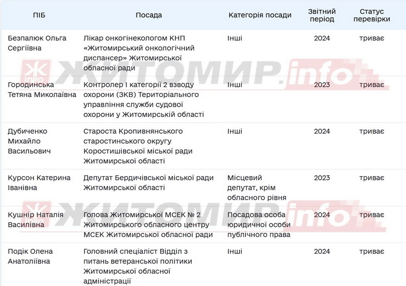 Станом на 4 листопада 2025 року триває перевірка таких декларації посадовців з Житомирської області: