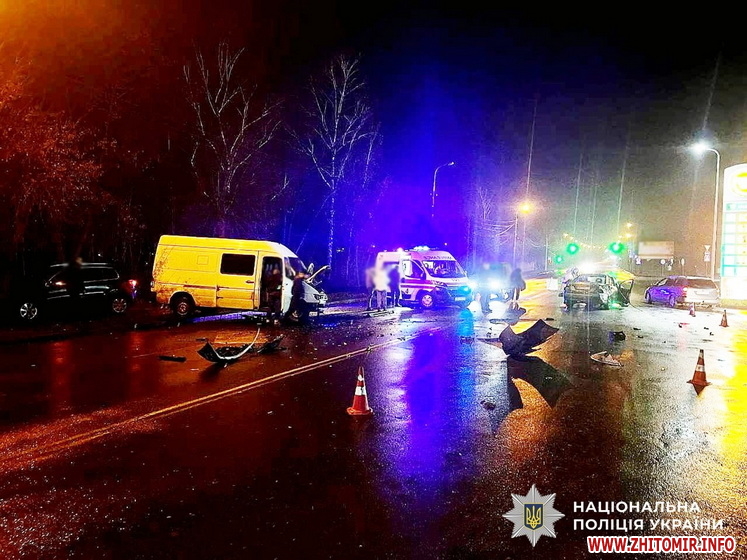 «За попередньою інформацією, 34-річна водійка автомобіля Mitsubishi, рухаючись вулицею Житомирською у напрямку площі Соборної, на заокругленій ділянці дороги не впоралася з керуванням і виїхала на зустрічну смугу. Там її авто зіткнулося з мікроавтобусом Mercedes Sprinter під керуванням 29-річного місцевого жителя. У цей момент позаду мікроавтобуса рухався Volkswagen Tiguan, який зіткнувся з бусом», - йдеться в повідомленні.