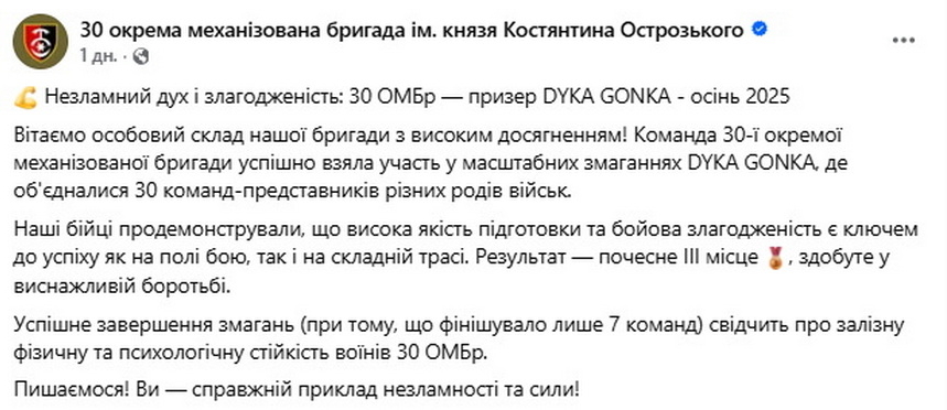 На сторінці у Facebook 30-ї окремої механізованої бригади ім. князя Костянтина Острозького 11 листопада привітали команду з результатом.