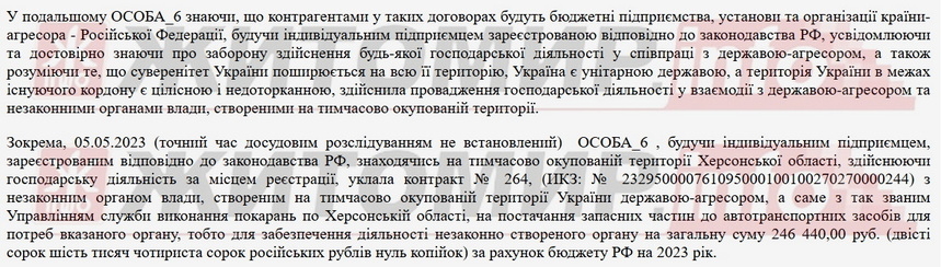 «Зокрема, 05.05.2023 (точний час досудовим розслідуванням не встановлений) ОСОБА_6, будучи індивідуальним підприємцем, зареєстрованим відповідно до законодавства РФ, знаходячись на тимчасово окупованій території Херсонської області, здійснюючи господарську діяльність за місцем реєстрації, уклала контракт № 264, (ИКЗ: № 232950000761095000100100270270000244) з незаконним органом влади, створеним на тимчасово окупованій території України державою-агресором, а саме з так званим Управлінням служби виконання покарань по Херсонській області, на постачання запасних частин до автотранспортних засобів для потреб вказаного органу, тобто для забезпечення діяльності незаконно створеного органу на загальну суму 246 440,00 руб. (двісті сорок шість тисяч чотириста сорок російських рублів нуль копійок) за рахунок бюджету РФ на 2023 рік. Надалі жінка виконала умови вищевказаного контракту, за що отримала оплату у зазначеному розмірі», - йдеться у матеріалах суду.