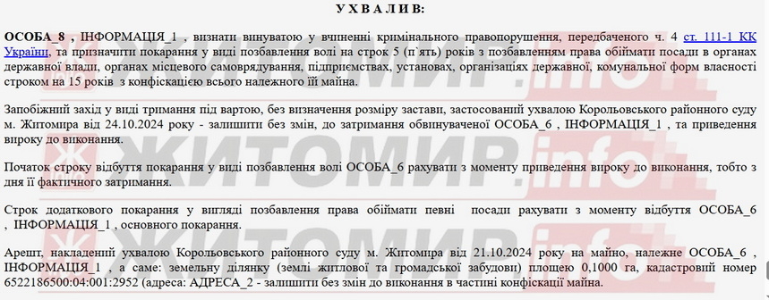 Як повідомляв Житомир.info, Корольовський районний суд м. Житомира 23 жовтня 2025 року виніс вирок за колабораційну діяльність колишньому головному редактору районної газети «Новини Сватівщини» з Луганської області. За співпрацю з російськими окупантами Сергій Кривонос отримав 12 років тюрми з конфіскацією майна.