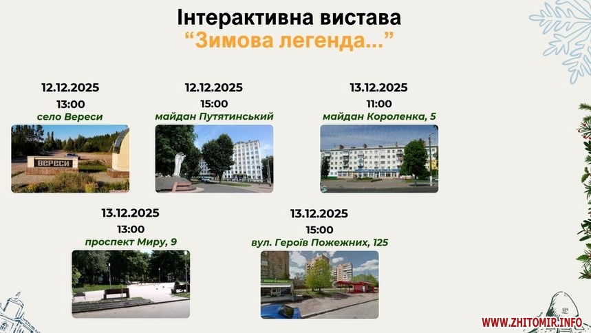 «Формат новорічних заходів у воєнний час ми пропрацювали максимально безпечний, адаптований до умов воєнного стану. В першу чергу – це резиденція Святого Миколая на базі Дому української культури у чітко визначені дні та години. Запрошуємо усіх батьків, викладачів записати дітей на заходи. Казкові програми «На крилах мрій» у палаці культури без надмірної кількості людей із можливістю поділити потоки дітей за часом, для безпеки дітей. Виїзна інтерактивна вистава «Зимова легенда» на десяти локаціях», – розповідає начальниця управління культури Житомирської міської ради Ілона Колодій.