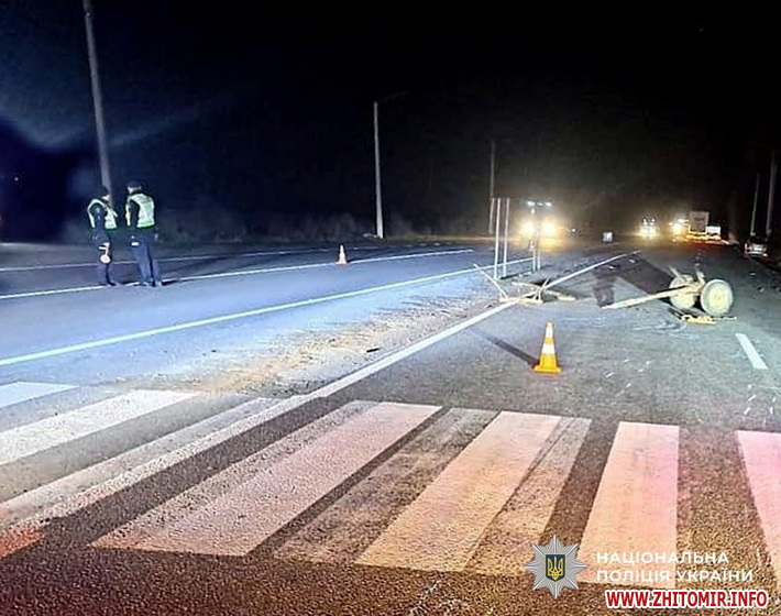 Попередньо, 57-річний водій автомобіля Nissan Note, рухаючись у напрямку м. Бердичів, здійснив наїзд на гужовий віз, який у той момент перетинав автошлях. Від удару легковик змінив траєкторію руху та з’їхав з проїжджої частини дороги.