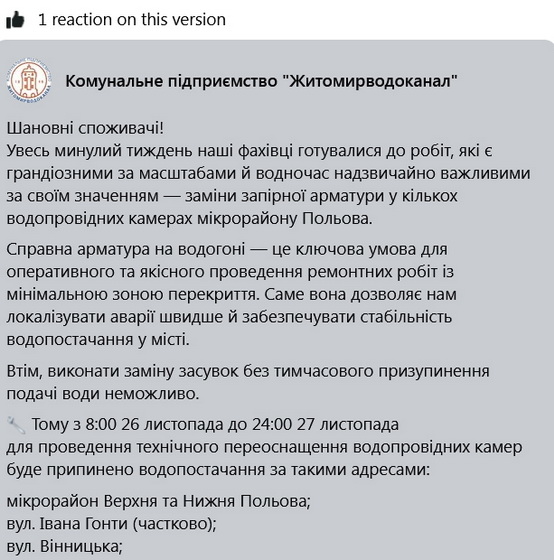 Як повідомляв Житомир.info, у квітні 2025 року через заміну засувки на міському водогоні жителів мікрорайону Польова та кількох вулиць й провулків попереджавли про обмеження водопостачання й просили зробити запас води.