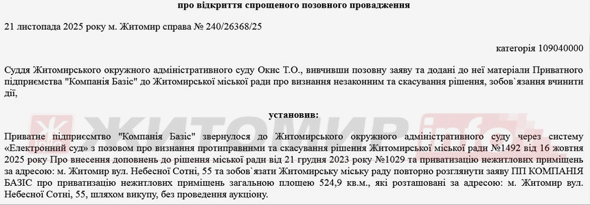 «Визнання протиправними та скасування рішення Житомирської міської ради №1492 від 16 жовтня 2025 року «Про внесення доповнень до рішення міської ради від 21 грудня 2023 року №1029 та приватизацію нежитлових приміщень за адресою: м. Житомир вул. Небесної Сотні, 55» та зобов`язати Житомирську міську раду повторно розглянути заяву ПП «Компанія Базіс» про приватизацію нежитлових приміщень загальною площею 524,9 кв.м., які розташовані за адресою: м. Житомир вул. Небесної Сотні, 55, шляхом викупу, без проведення аукціону», - йдеться у позовних вимогах.