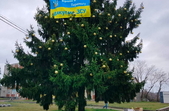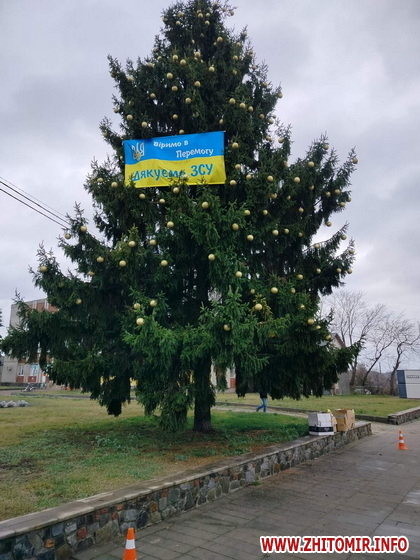 У Ємільчиному цього тижня прикрасили центральну ялинку. Живе дерево, яке росте у центрі селища, оздобили у патріотичних кольорах, а в центрі ялини розмістили жовто-блакитний прапор з тризубом та написом «Віримо у перемогу. Дякуємо ЗСУ».