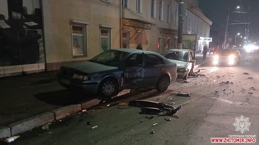У Житомирі в неділю, 7 грудня 2025 року, сталися дві ДТП, в яких автомобілі зазнали значних пошкоджень, але обійшлося без постраждалих: в одному випадку водій не надав перевагу в русі авто на головній дорозі, а в іншому водій напідпитку протаранив припарковані автомобілі.
