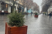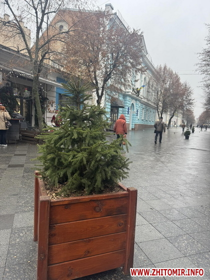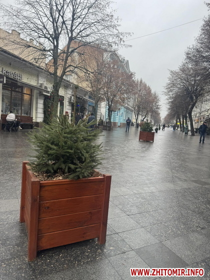 Пішохідну вулицю у Житомирі прикрасили живими ялинками, які ростуть у горщиках.