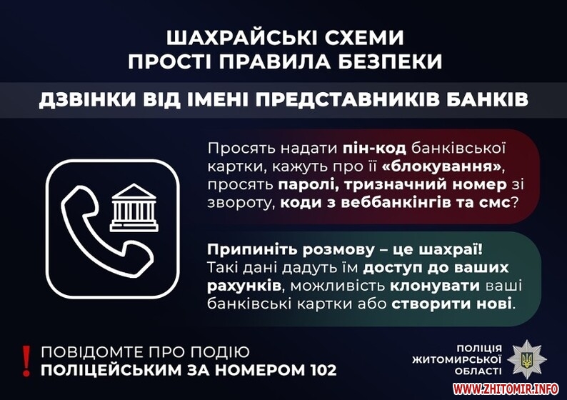 Як повідомляв Житомир.info, у грудні 2025 року до Житомирського райуправління поліції № 1 звернувся житомирянин, який після дзвінка з «банку» втратив 25 тис. грн з рахунку.