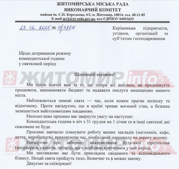Житомирська міська рада розіслала керівникам підприємств, установ, організацій та суб’єктам господарювання лист із нагадуванням про комендантську годину, яка не скасовується під час новорічної ночі.