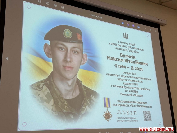 Нагадаємо, 25 червня 2024 року у Житомирі попрощалися 29-річним військовослужбовцем Максимом Булигіним, який пішов захищати Україну з перших днів повномасштабного вторгнення. 16 квітня 2025 року рідним Максима вручили орден «За мужність» III ступеня (посмертно).