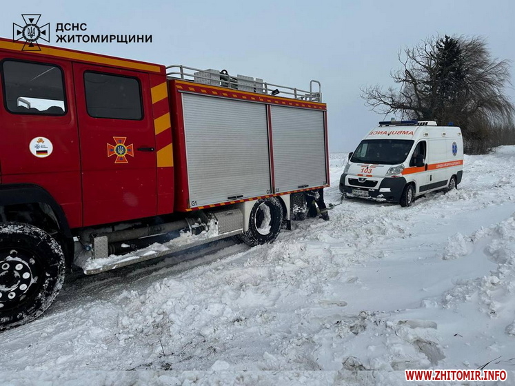«Вчора у селі Вербівка Бердичівського району фахівці ДСНС надали допомогу працівникам швидкої допомоги, які прямували на виклик та застрягли у сніговому заметі. За допомогою троса та пожежного автомобіля транспортний засіб відбуксирували на безпечну ділянку дороги, після чого він продовжив рух самостійно. Також у селі Ставки Житомирського району рятувальники надали допомогу водіям рейсового автобуса з пасажирами та легкового автомобіля. Подібні аварійно-рятувальні роботи проводилися надзвичайниками у селах Зарудинці та Яроповичі Бердичівського району», - йдеться у повідомленні.