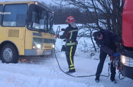 «У селі Горбулів Житомирського району рятувальники прийшли на допомогу рейсовому автобусу, який із пасажирами потрапив у сніговий замет. За допомогою тросу його оперативно відбуксирували та звільнили з пастки зими. Рух відновлено, люди — в безпеці», - йдеться у повідомленні.
