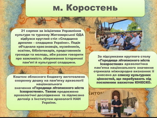 4 грудня у Мінкульті повідомили, що до списку культурних цінностей під захистом ЮНЕСКО внесли ще 19 українських об’єктів, один з них – у Житомирській області. Йдеться про городище літописного міста Іскоростень, м. Коростень.