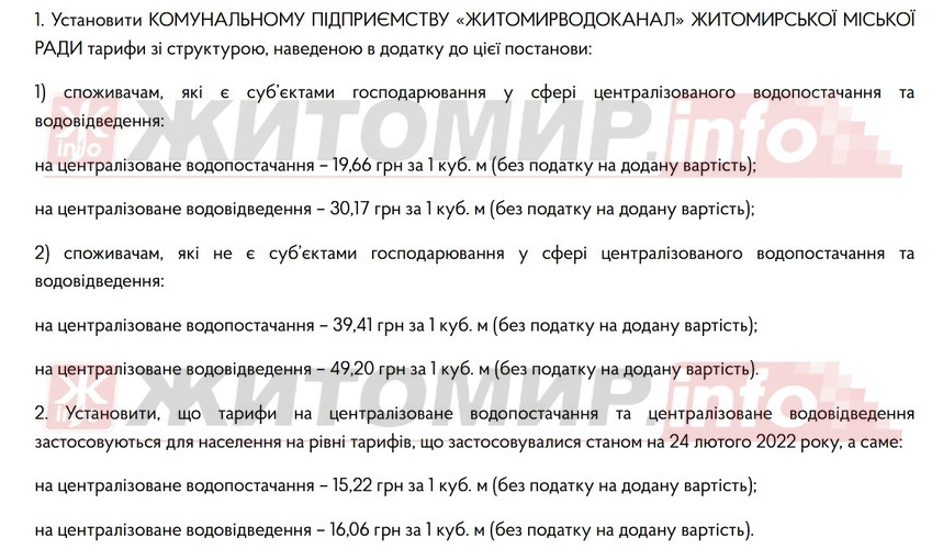 Як повідомляв Житомир.info, у Житомирі з 1 січня 2022 року зросли тарифи на водопостачання та водовідведення і вони були однакові для всіх категорій споживачів – 37,53 грн за 1 куб.м. НКРЕКП з 1 червня 2024 року змінила тарифи на водопостачання та водовідведення для непобутових споживачів низки водоканалів, зокрема, у Житомирі вартості 1 куб.м води зросла більш ніж у два рази, а з 1 січня 2025 року знову збільшили тарифи «Житомирводоканалу» для всіх споживачів, крім населення.