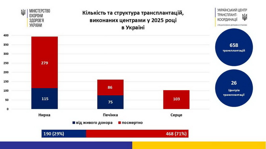 Впродовж 2025 року в українських центрах трансплантації виконали 658 пересадок органів, зокрема у житомирській обллікарні – 3.