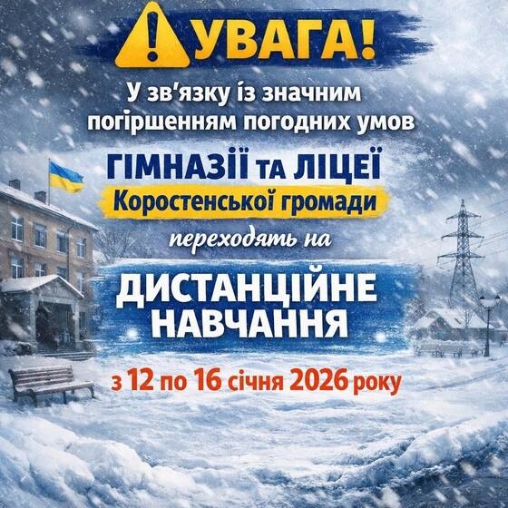 Про перехід на дистанційне навчання з 12 січня 2026 року у гімназіях і ліцеях Коростенської громади повідомили й у Коростенській міськраді.