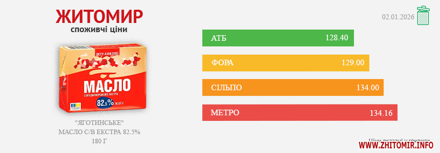 Моніторинг здійснено на основі інформації, отриманої за методом контрольної закупки 02.01.2026 р. у місцях продажу: АТБ, пр. Миру, 15а, Фора, вул. Київська, 106, Метро, вул. Ватутіна, 55в, Сільпо, вул. Житній ринок, 1