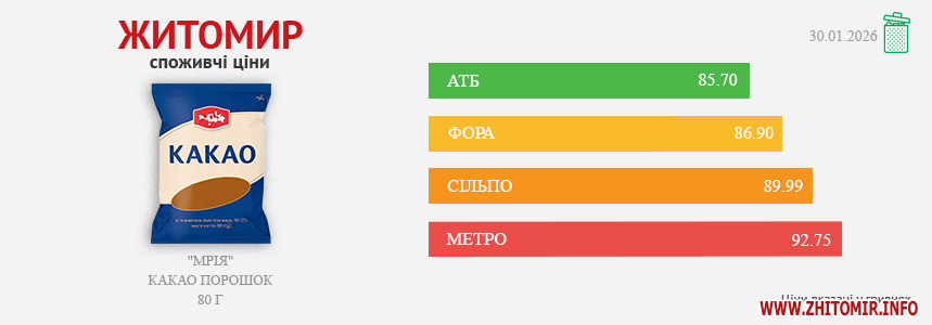 Моніторинг здійснено на основі інформації, отриманої за методом контрольної закупки 30.01.2026 р. у місцях продажу: АТБ, пр. Миру, 15а, Фора, вул. Київська, 106, Метро, пр. Незалежності, 55в, Сільпо, вул. Житній ринок, 1