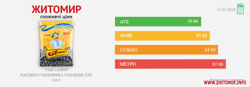Моніторинг здійснено на основі інформації, отриманої за методом контрольної закупки 13.02.2026 р. у місцях продажу: АТБ, вул. Корольова, 44, Фора, вул. Київська, 106, Метро, пр. Незалежності, 55в, Сільпо, вул. Житній ринок, 1