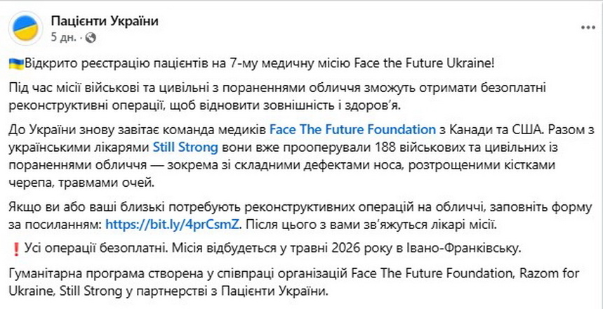 У Благодійному фонді «Пацієнти України» зазначили, що також відкрита реєстрація на сьому місію «Face the Future Ukraine», яка відбудеться у травні 2026 в Івано-Франківську. Подати заявку можна за посиланням.