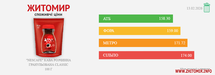 Моніторинг здійснено на основі інформації, отриманої за методом контрольної закупки 13.02.2026 р. у місцях продажу: АТБ, вул. Корольова, 44, Фора, вул. Київська, 106, Метро, пр. Незалежності, 55в, Сільпо, вул. Житній ринок, 1