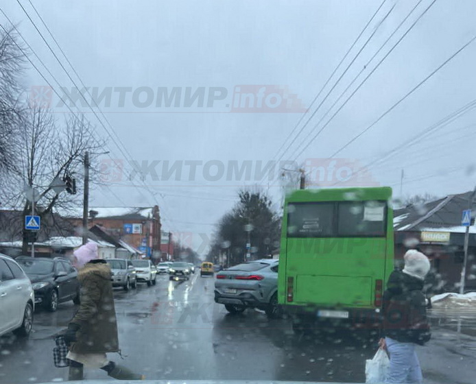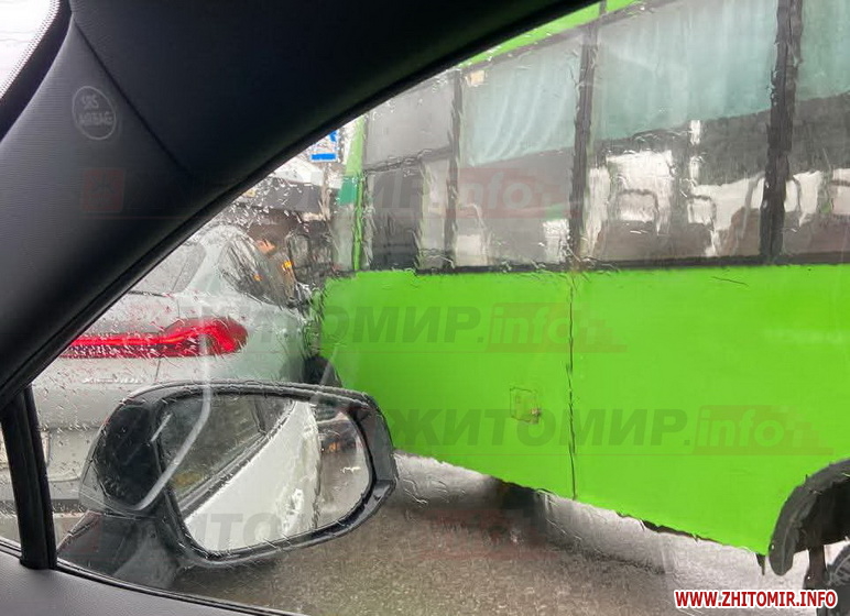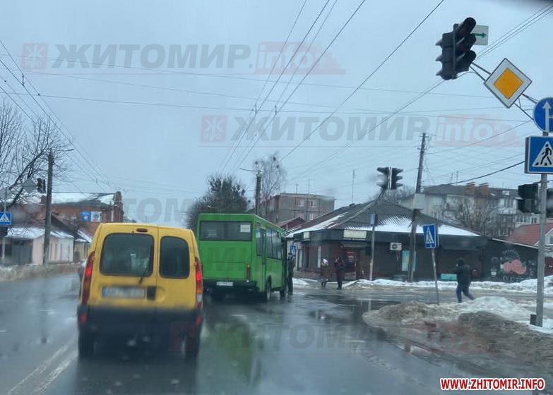 Вдень 23 лютого на перехресті вулиць Михайла Грушевського і Хлібної у Житомирі зіткнулись легковик і маршрутний автобус.