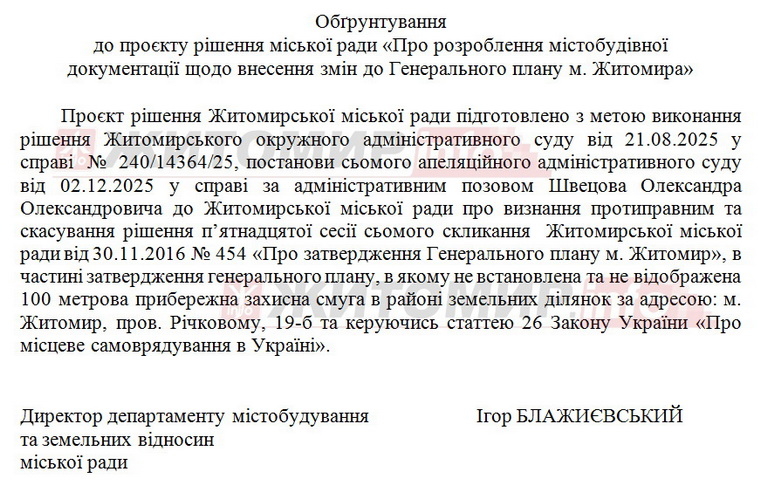 «Визнати протиправним та нечинним рішення п`ятнадцятої сесії сьомого скликання Житомирської міської ради від 30.11.2016 № 454 «Про затвердження Генерального плану міста Житомира» в частині затвердження генерального плану, в якому не встановлена та не відображена 100 метрова прибережна захисна смуга в районі земельних ділянок за адресою м. Житомир провулок Річковий, 19-б. Зобов`язати Житомирську міську раду внести зміни до Генерального плану міста Житомир, з урахуванням висновків, викладених в рішенні суду», - йдеться у рішенні окружного адміністративного суду, яке набрало чинності 2 грудня 2025 року.