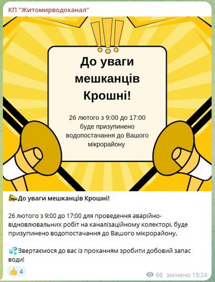 «До уваги мешканців Крошні! 26 лютого з 9:00 до 17:00 для проведення аварійно-відновлювальних робіт на каналізаційному колекторі буде призупинено водопостачання до Вашого мікрорайону. Звертаємося до вас із проханням зробити добовий запас води», - йдеться у повідомленні.