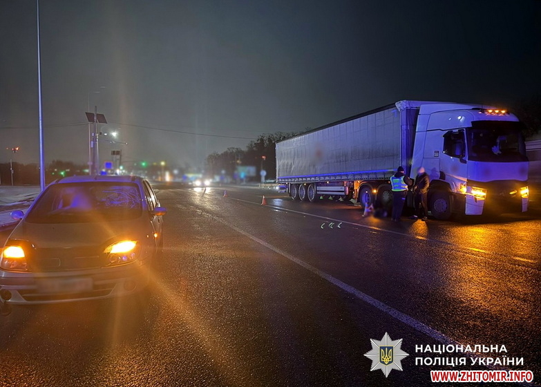 «Подія сталася 25 лютого близько 20:20 на 125 км автошляху Виступовичі – Житомир – Могилів-Подільський, неподалік села Зарічани. На місці події працювала слідчо-оперативна група Житомирського районного управління поліції № 1. За попередньою інформацією, 44-річний житель Вінниччини, перебуваючи за кермом автомобіля Renault, під час руху у напрямку міста Бердичева здійснив наїзд на жінку, яка знаходилася на автошляху. Після цього вона потрапила під колеса автопоїзда під керуванням 36-річного жителя Кіровоградщини», - йдеться у повідомленні.