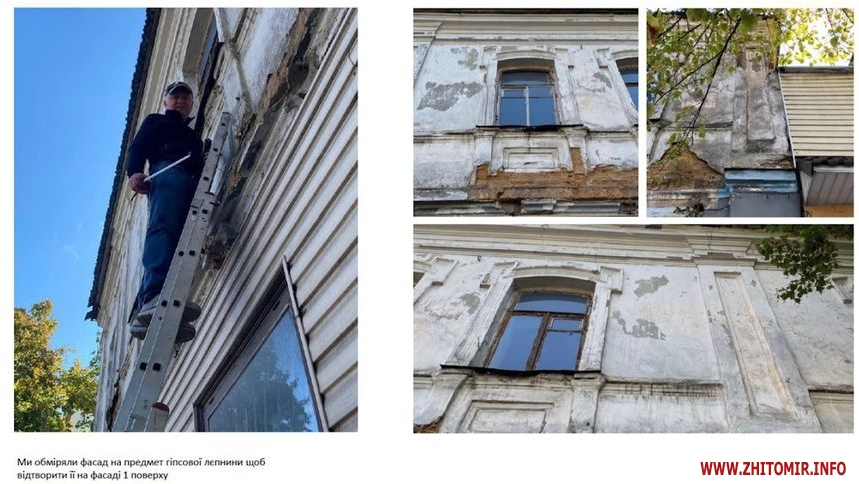 У Житомирі проведуть реконструкцію будинку на вулиці Велика Бердичівська, 24. Споруда, зведена у 1880-х роках, є рядовою історичною забудовою вулиці. Фасад у незадовільному стані, всередині тріщини на стінах та руйнується дах – такий вигляд має будівля 27 лютого.