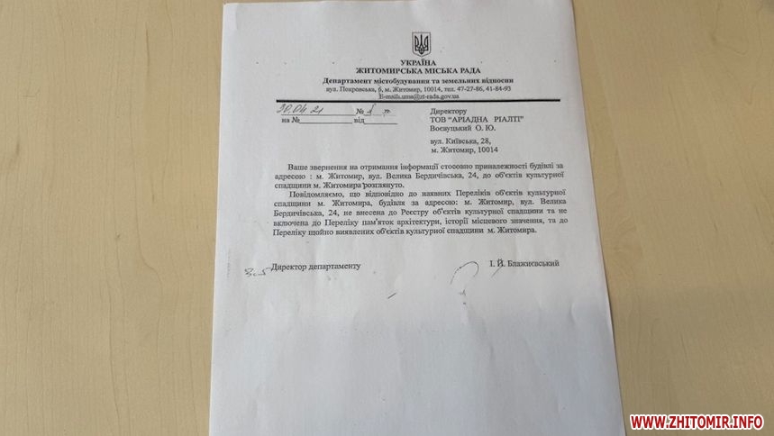 Як повідомляв Житомир.info, у січні 2014 року з аварійного будинку по вул. Велика Бердичівська почали виселяти громадські організації, які орендували там приміщення: міські влади збиралися його продати, тому що немає грошей на ремонт. В липні 2014 року на аукціоні продали нежитлові приміщення площею 322,9 кв.м у дореволюційному будинку №24 на вулиці Велика Бердичівська: початкова вартість об'єкта з урахуванням ПДВ була 1 млн 46 тис. 197,20 грн, за результатами аукціону приміщення продали за 1,7 млн грн.