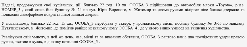 «03.02.2026 близько 22 год. 08 хв., ОСОБА_3 перебував на парковці, поблизу будинку № 70-Б по вул. Велика Бердичівська, м. Житомир, де у нього виник умисел на вчинення хуліганства. Реалізуючи свій умисел (…), підійшов до автомобіля марки «VOLKSWAGEN», р.н.з. НОМЕР_2, та своєю правою рукою, зжатою в кулак, наніс вісім послідовних удари по лобовому склі автомобіля, пошкодивши його», – йдеться у матеріалах суду.