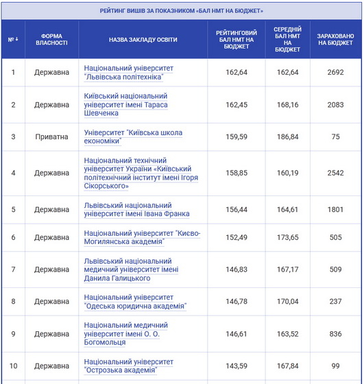 Найвищі середні бали національного мультипредметного тесту для зарахування на бюджет був у приватному університеті «Київська школа економіки» – 186,84 (зараховано 75 людей), національному університеті «Києво-Могилянська академія» – 173,65 (зараховано 505 людей) та національному університеті «Одеська юридична академія» – 170,04 (зараховано 237 людей). За кількістю рейтингових балів НМТ на бюджет ці виші входять в першу десятку.