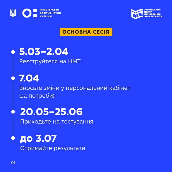 «Тестування проходитиме як в Україні, так і за її межами. Перелік країн і міст за кордоном буде оприлюднено до 3 березня. Плануйте заздалегідь, перевіряйте персональний кабінет і зберігайте цей допис, щоб усі ключові етапи НМТ-2026 були напохваті», - йдеться в повідомленні.