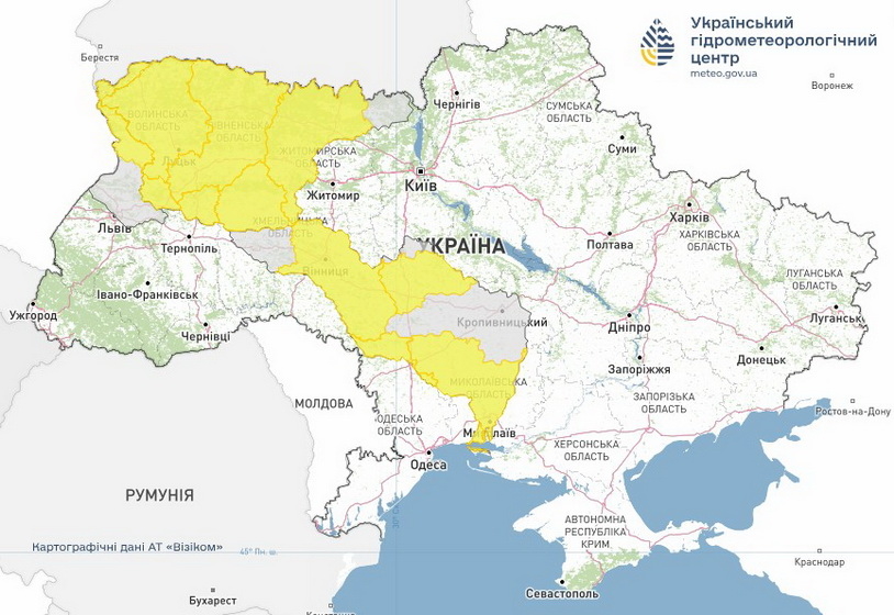 «05-06 березня на рiчках суббасейну Прип'ятi та окремих рiчках басейну Захiдного Бугу продовжаться підвищення рiвнiв води на 0,1-0,4 м над поточними рiвнями з можливим виходом та подальшим затопленням заплав (І рівень небезпеки - жовтий). На рiчках вiдбуватиметься послаблення льодових явищ, мiсцями льодохiд», - зазначають в Укргідрометцентрі.