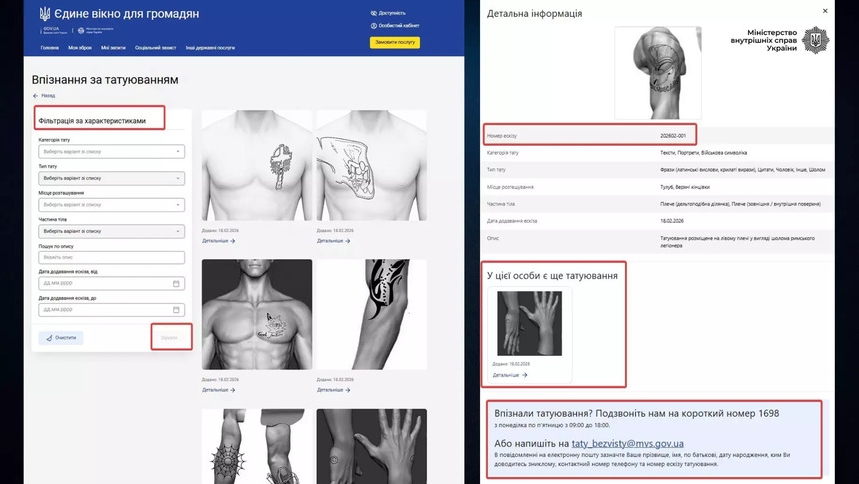 “Міністерство внутрішніх справ України запускає новий онлайн-розділ “Впізнання за татуюванням” на порталі “Єдине вікно для громадян”. Його створено для сприяння ідентифікації осіб, зниклих безвісти за особливих обставин. У розділі, який розміщено в категорії “Розшук”, публікуються ескізи татуювань з неідентифікованих тіл, доставлених на підконтрольну територію України в межах репатріаційних та евакуаційних заходів. Ресурс покликаний допомогти органам досудового розслідування у встановленні особи загиблих”, - йдеться у повідомленні.