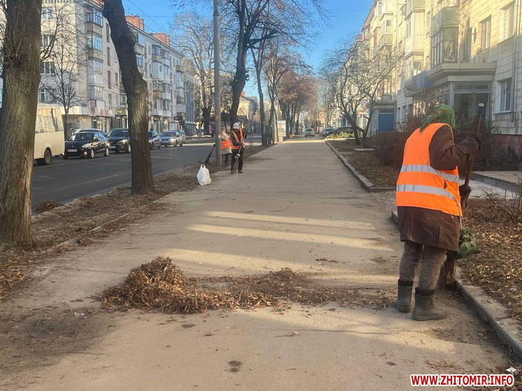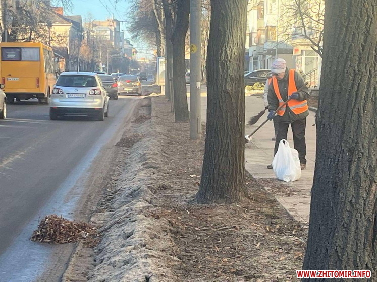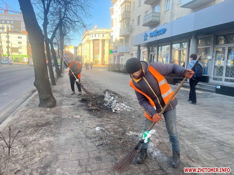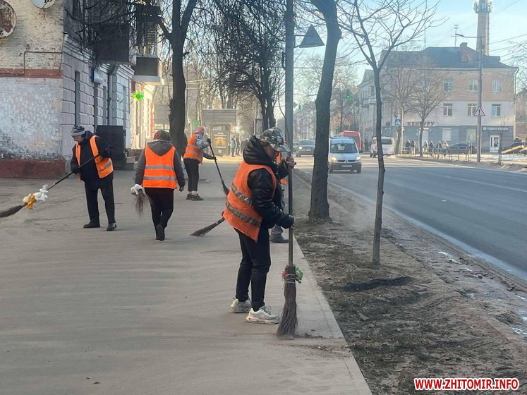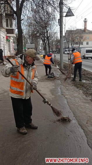 «На трьох вулицях Житомира прибирають узбіччя після зими. Працівники КП «Управління автомобільних шляхів» сьогодні прибирають узбіччя та тротуари на вулицях Київській, Сціборського та Театральній. Комунальники підмітають пісок, бруд і торішнє листя, які накопичилися вздовж доріг після зимового періоду. Сміття збирають у мішки та вивозять. До робіт залучені 14 працівників підприємства. Роботи тривають у межах планового прибирання міських вулиць», - йдеться в повідомленні.