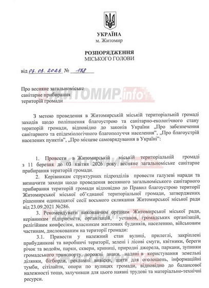 «Провести в Житомирській міській територіальній громаді з 11 березня до 03 квітня 2026 року весняне загальноміське санітарне прибирання територій громади. Керівникам структурних підрозділів провести галузеві наради та визначити заходи щодо проведення весняного загальноміського санітарного прибирання територій громади відповідно до Правил благоустрою території Житомирської міської об'єднаної територіальної громади, затверджених рішенням одинадцятої сесії восьмого скликання Житомирської міської ради від 23.09.2021 №286», - йдеться у розпорядженні.
