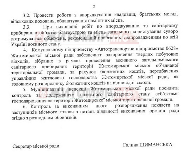 Виконавчим органам Житомирської міської ради, керівникам підприємств, організацій, установ, громадських організацій, релігійним конфесіям, власникам житлових будинків, населенню, військовим частинам, дислокованим на території громади рекомендують привести у належний стан вулиці, прилеглі, закріплені прибудинкові та виробничі території, зелені і лісові смуги, квітники, береги річок та водойм, парки, сквери, криниці, природні джерела, паркани, зупинки громадського транспорту, дорожні знаки, надані в користування земельні ділянки, бігборди, рекламні вивіски, щити для оголошень, інформаційні тумби, сітілайти, опори по вулицях громади, відповідно до балансової належності тощо, залучивши для цього наявні трудові та матеріально-технічні ресурси.